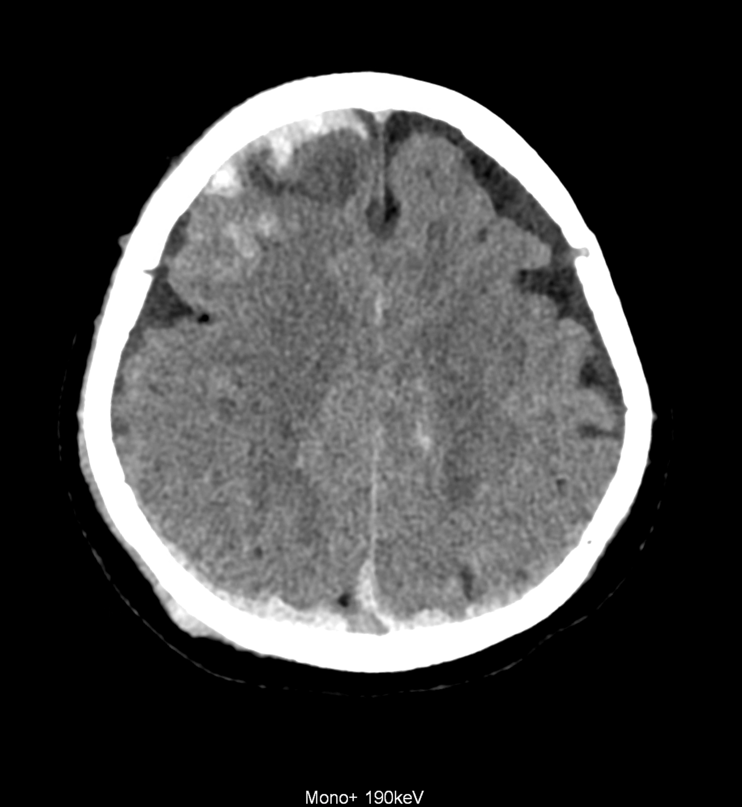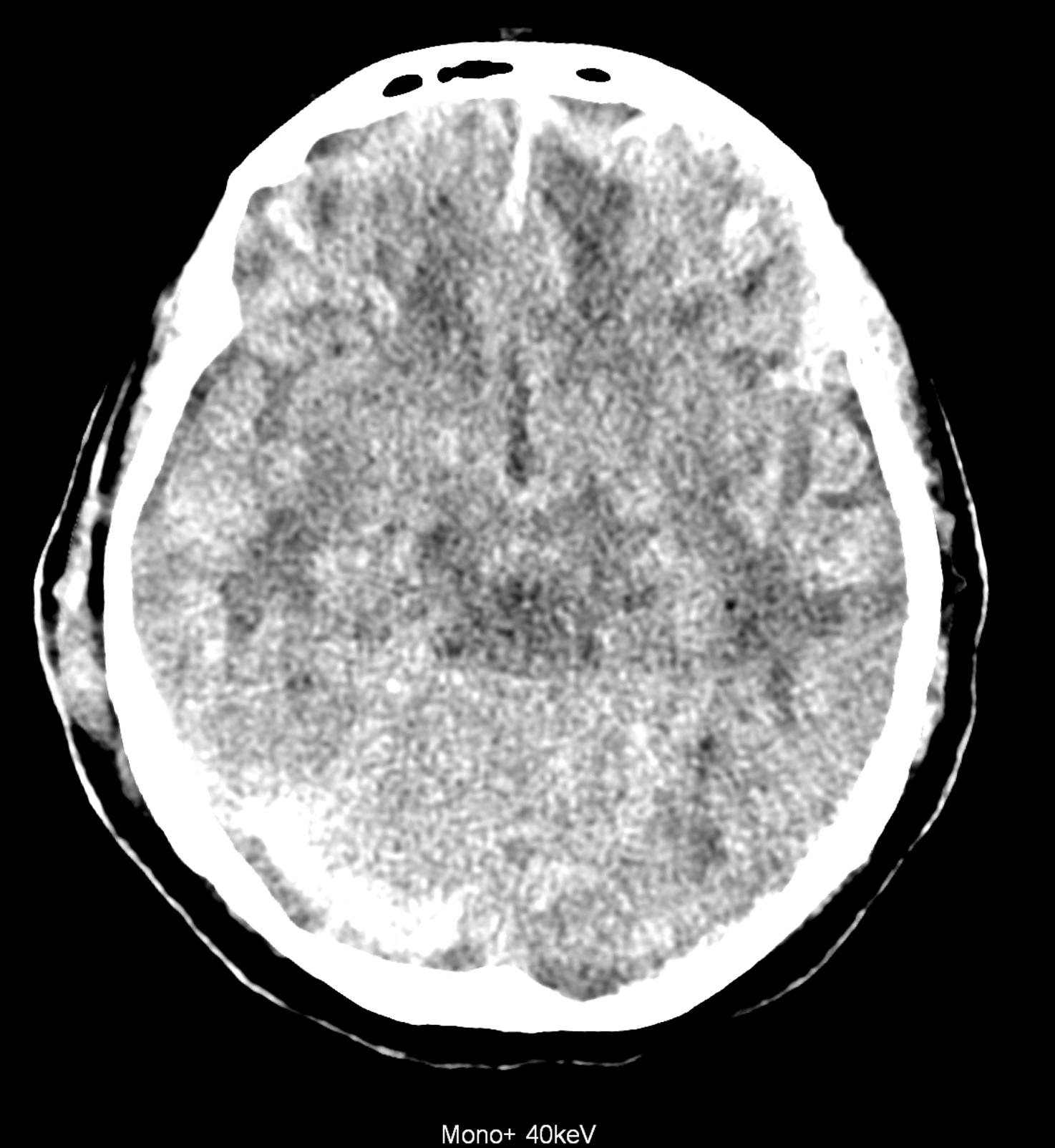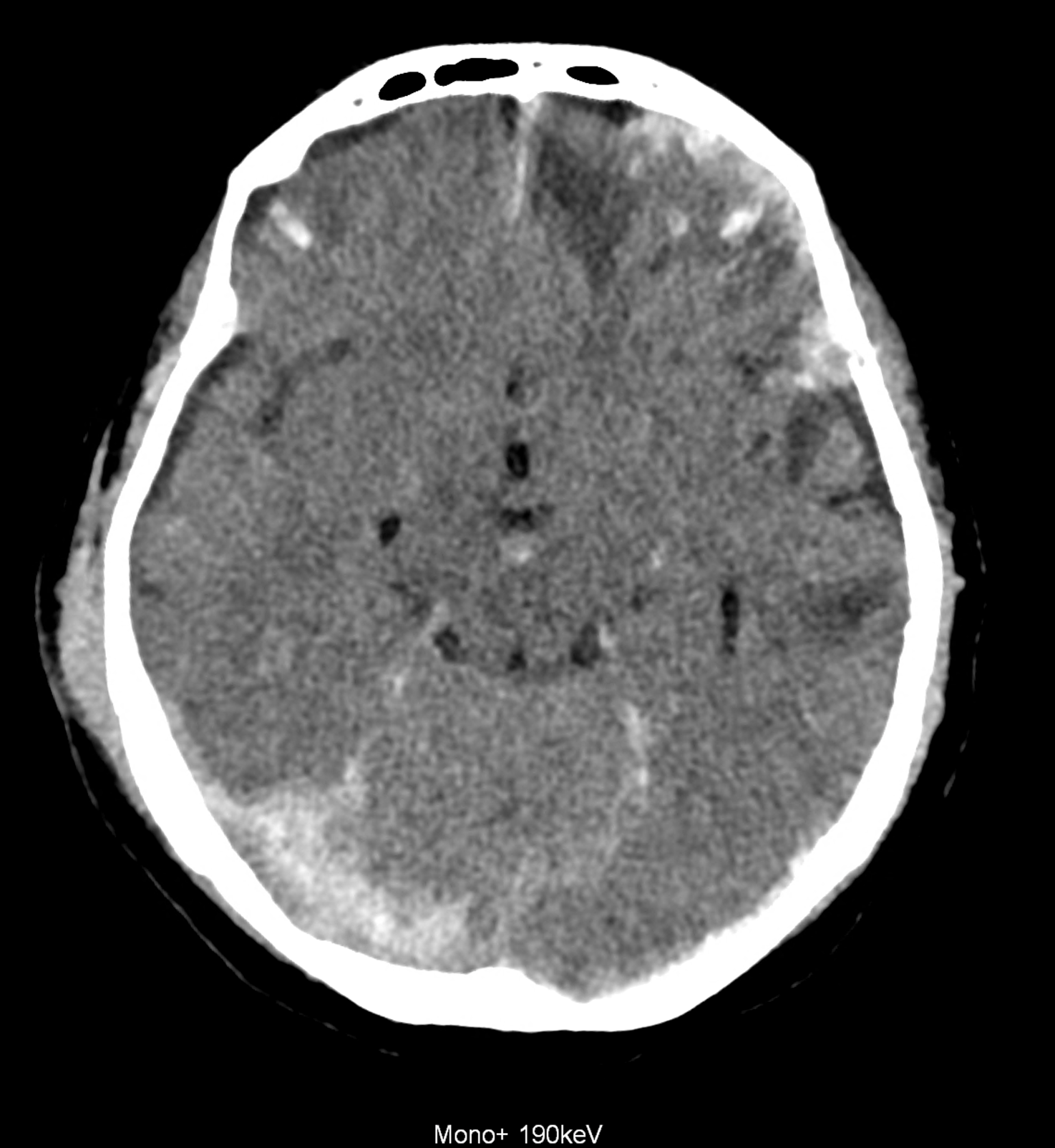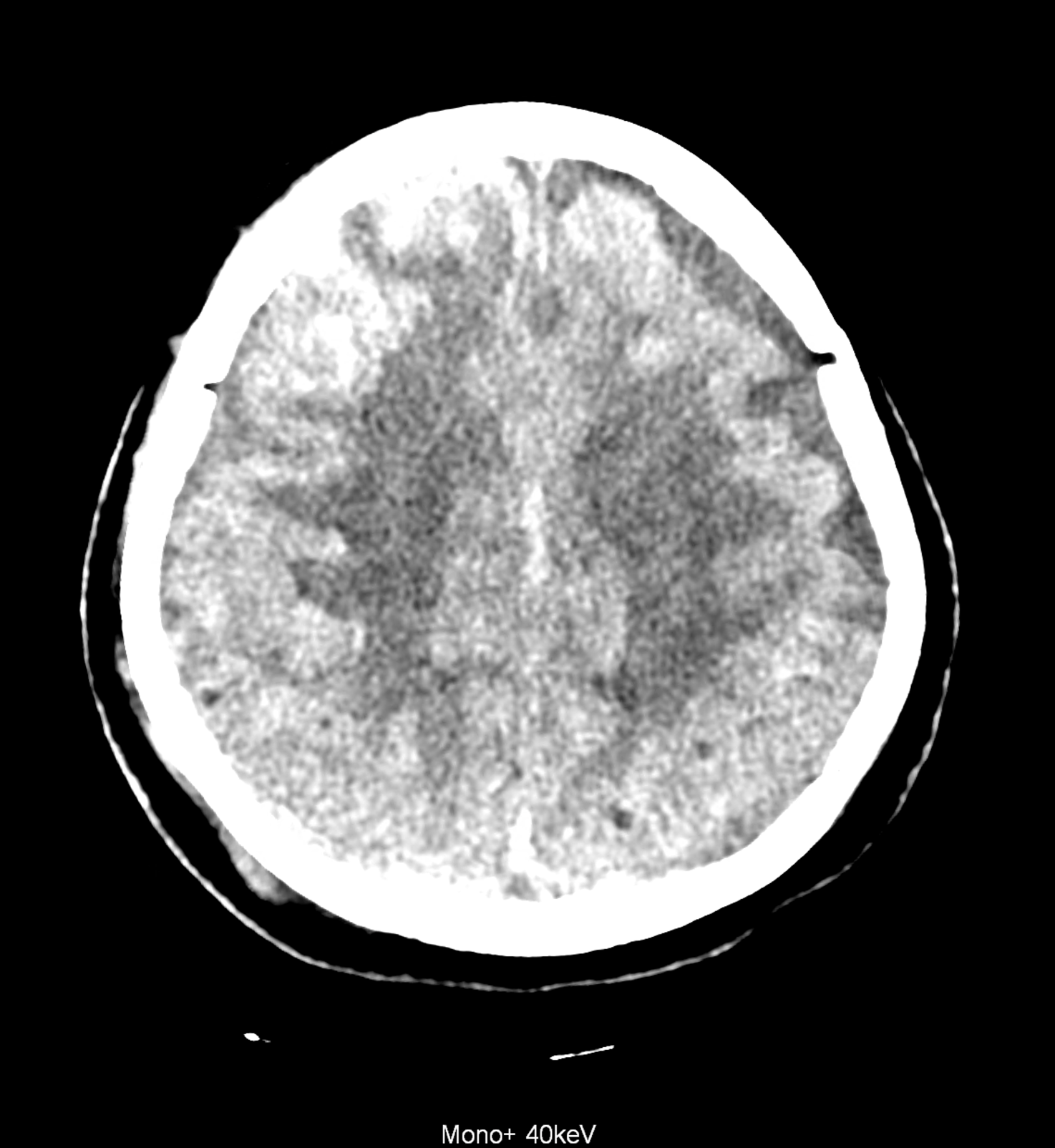Bleeding is characterized by different absorption characteristics than healthy brain tissue (both gray and white matter) and cerebrospinal fluid. Due to the higher proportion of proteins with amino acids with disulfide bonds, the signal intensity increases at higher energies, making it possible to use monoenergetic imaging at energies above 140 keV, and/or virtual non-contrast. The hemorrhage then becomes more hyperdense, while the rest of the brain tissue acquires a uniform low signal. In addition to bleeding, areas of extracellular fluid of vasogenic origin are also imaged, i.e., in areas around contusion-type brain tissue injuries.
