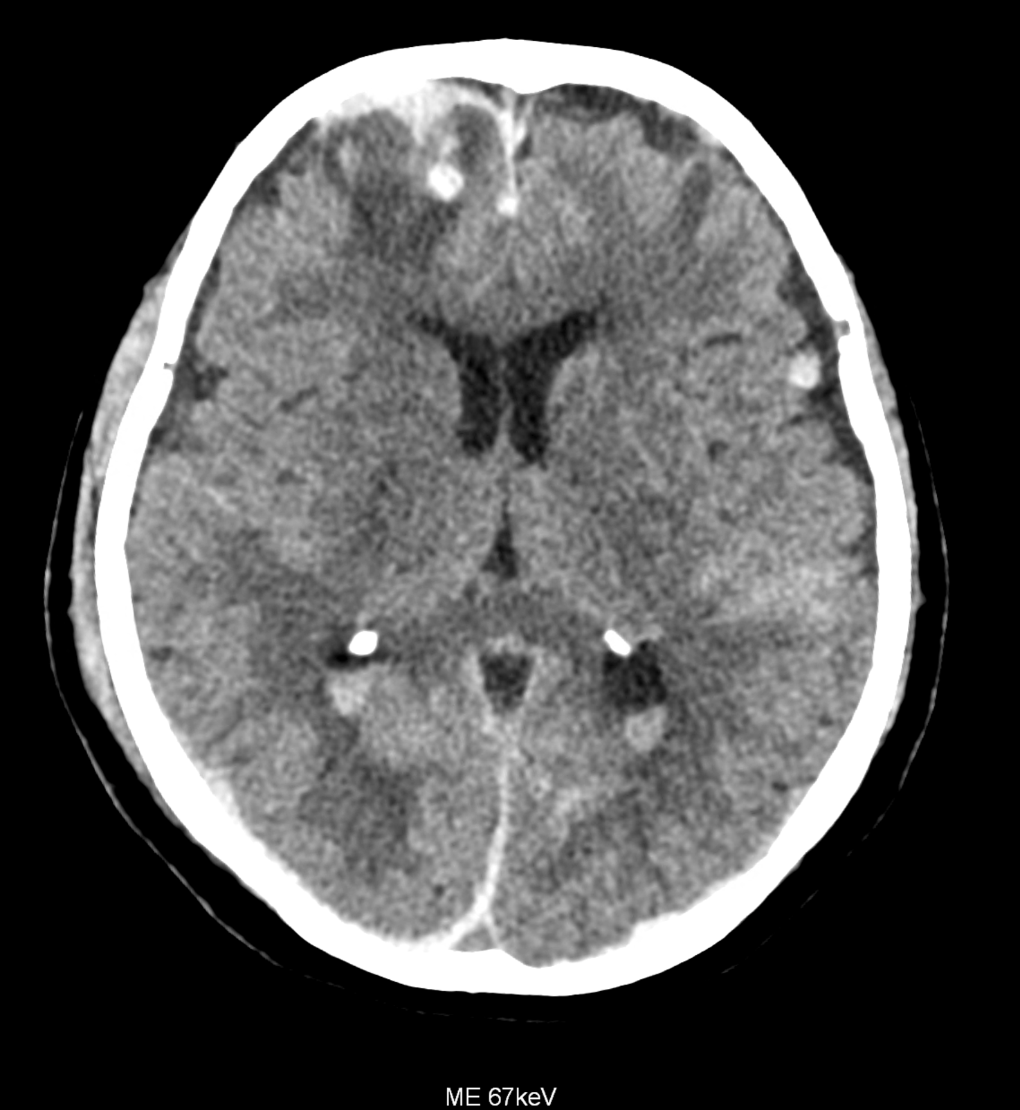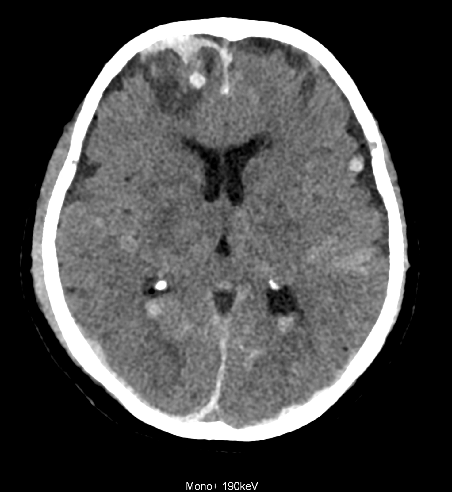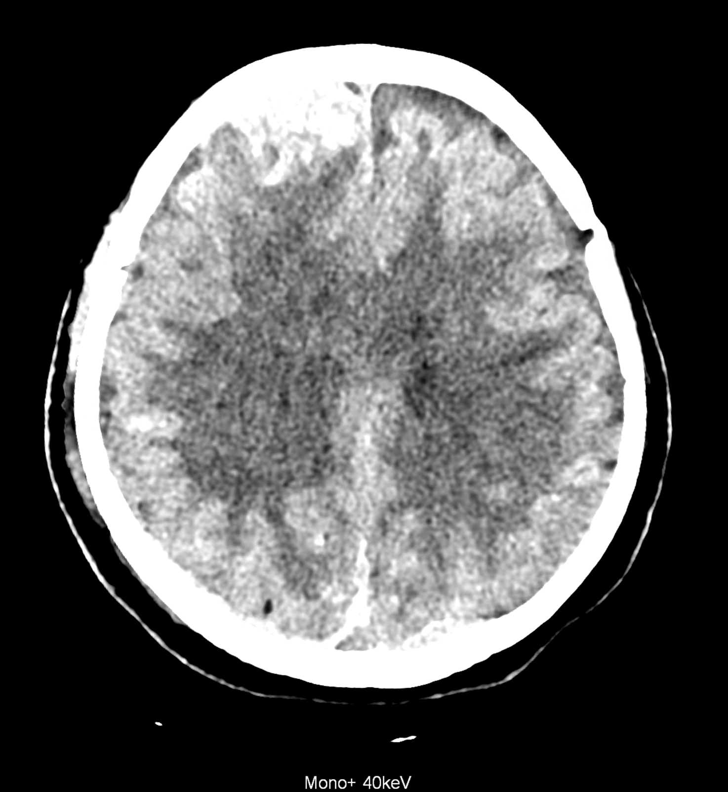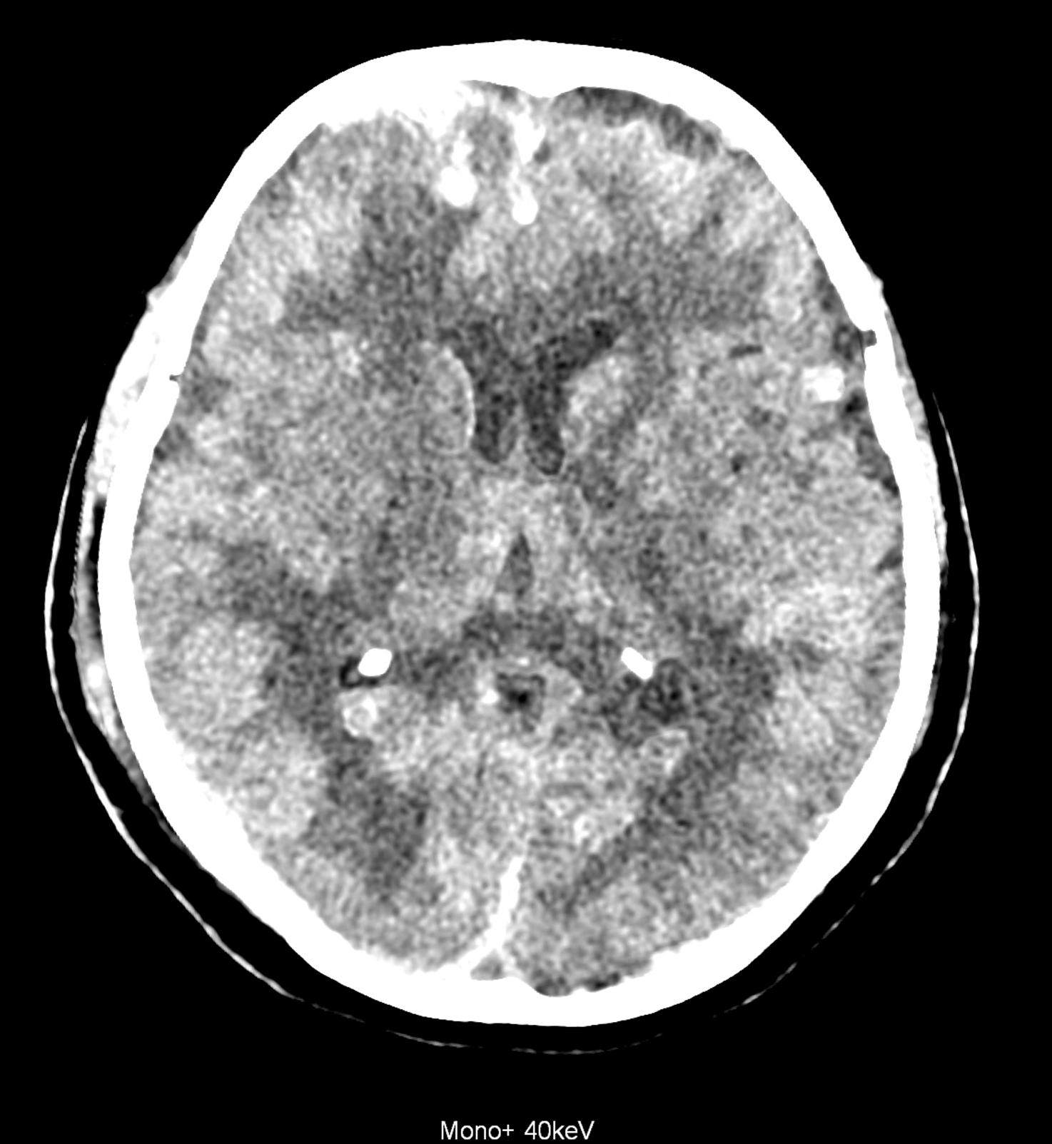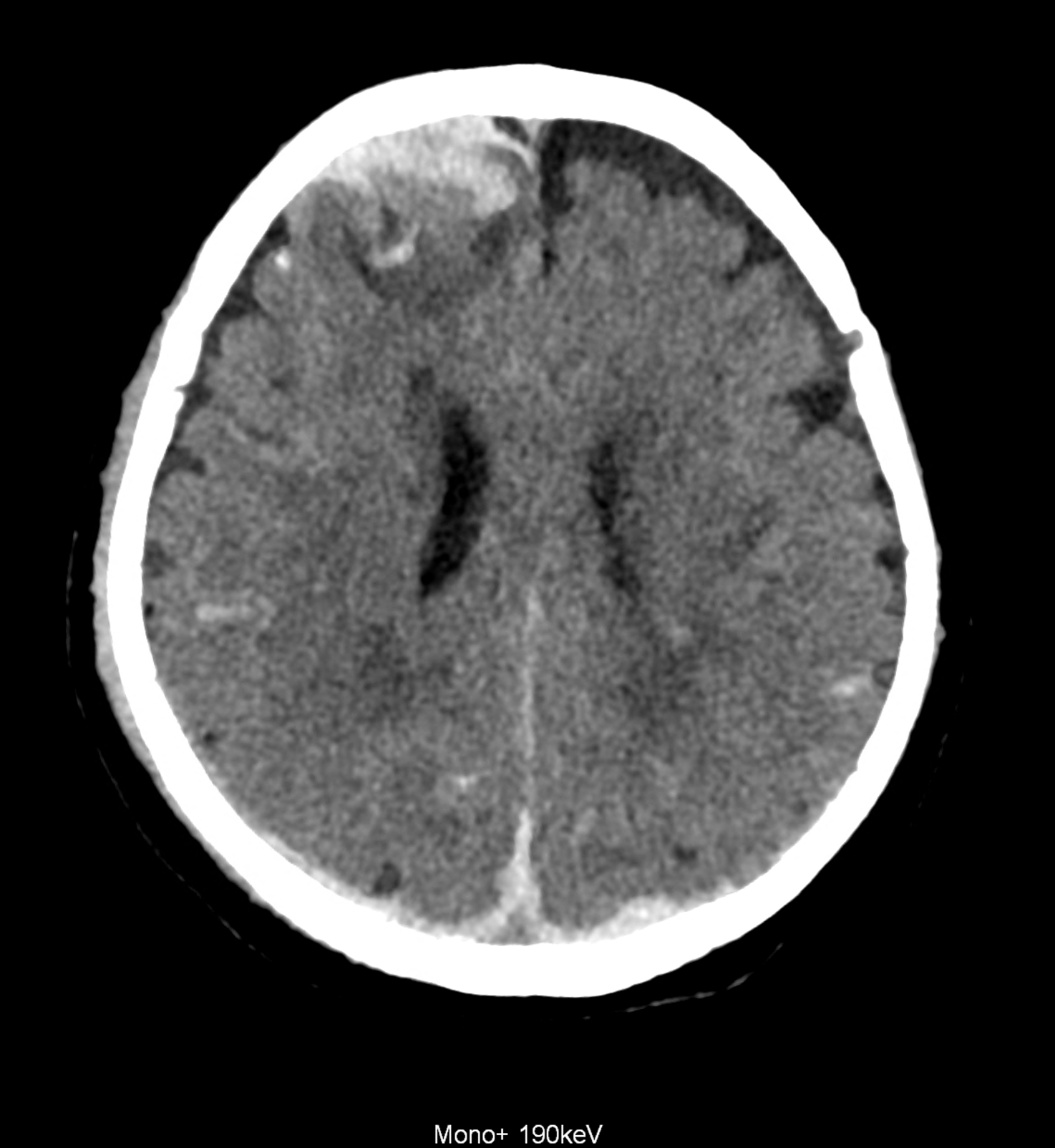 Bleeding is characterized by different absorption characteristics than healthy brain tissue (both gray and white matter) and cerebrospinal fluid. Due to the higher proportion of proteins with amino acids with disulfide bonds, the signal intensity increases at higher energies, making it possible to use monoenergetic imaging at energies above 140 keV, and/or virtual non-contrast. The hemorrhage then becomes more hyperdense, while the rest of the brain tissue acquires a uniform low signal. In addition to bleeding, areas of extracellular fluid of vasogenic origin are also imaged, i.e., in areas around contusion-type brain tissue injuries.