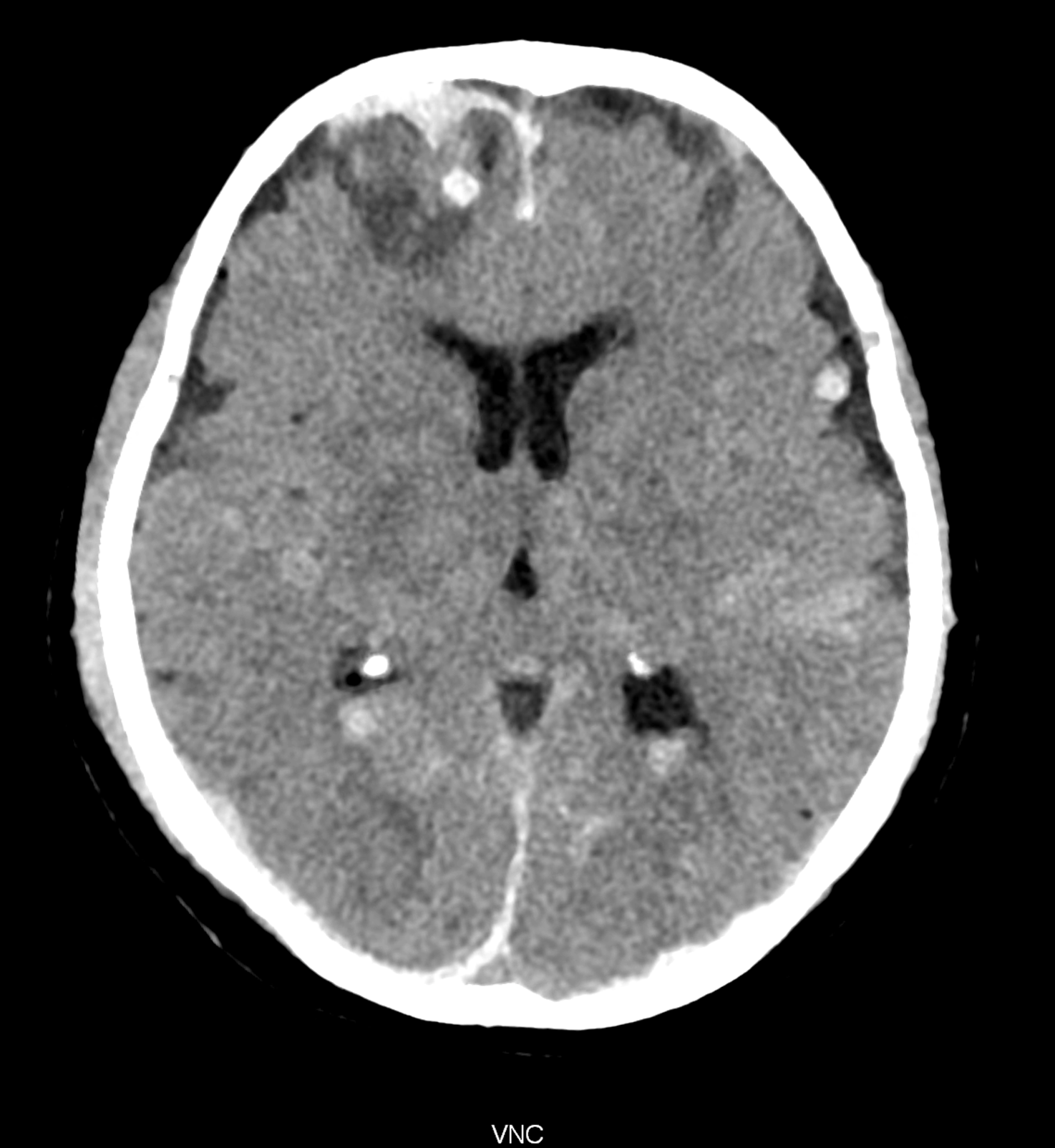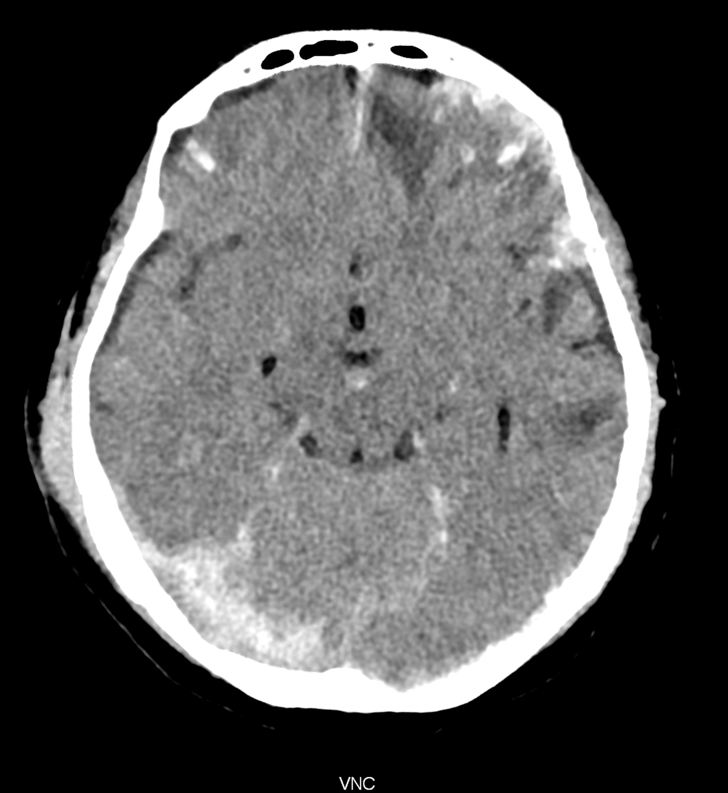 An example of the use of spectral imaging in complex brain injury, where contusions, diffuse axonal injury, subarachnoid hemorrhage, subdural hemorrhage, and blood in the ventricular system are present.