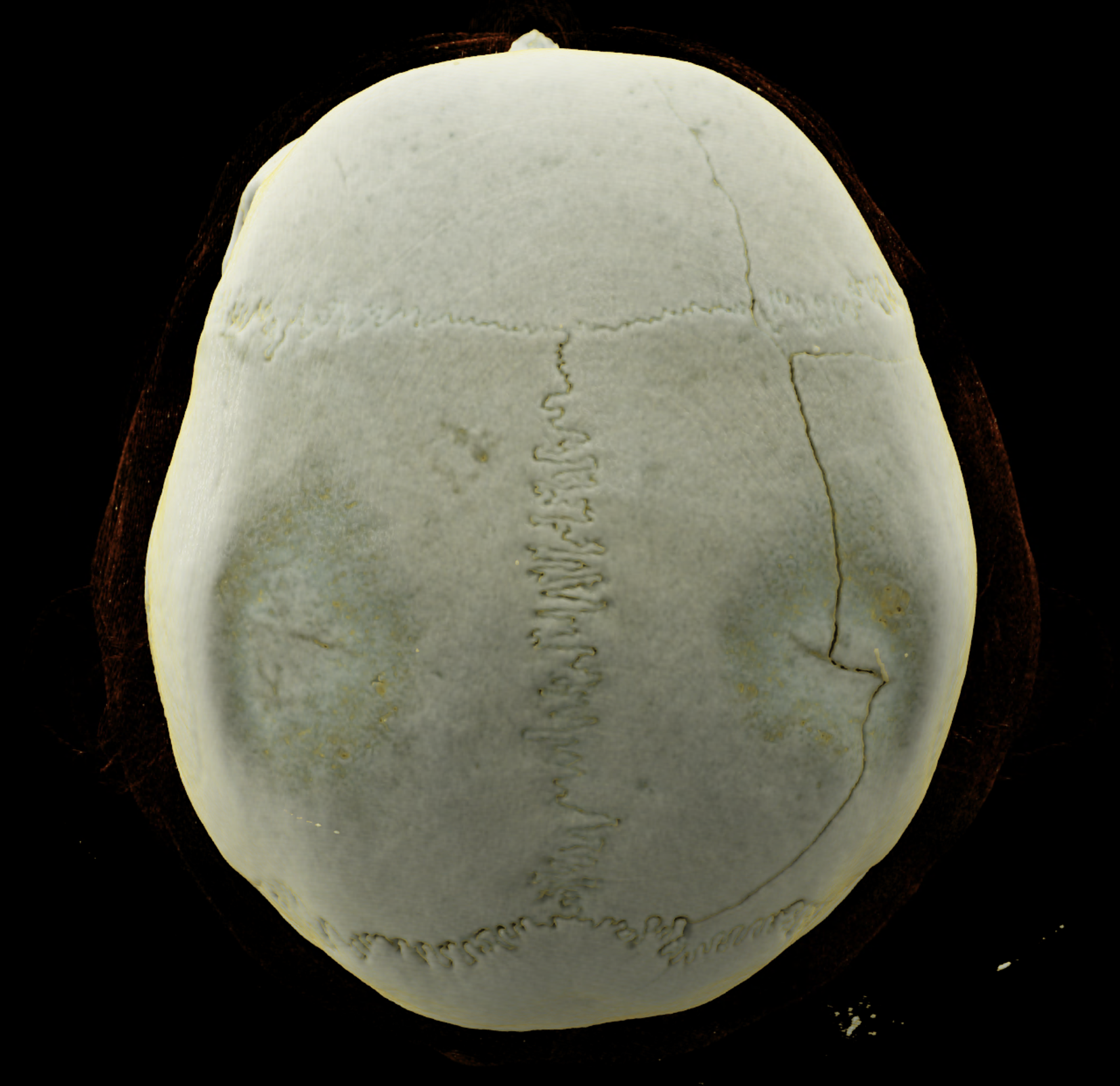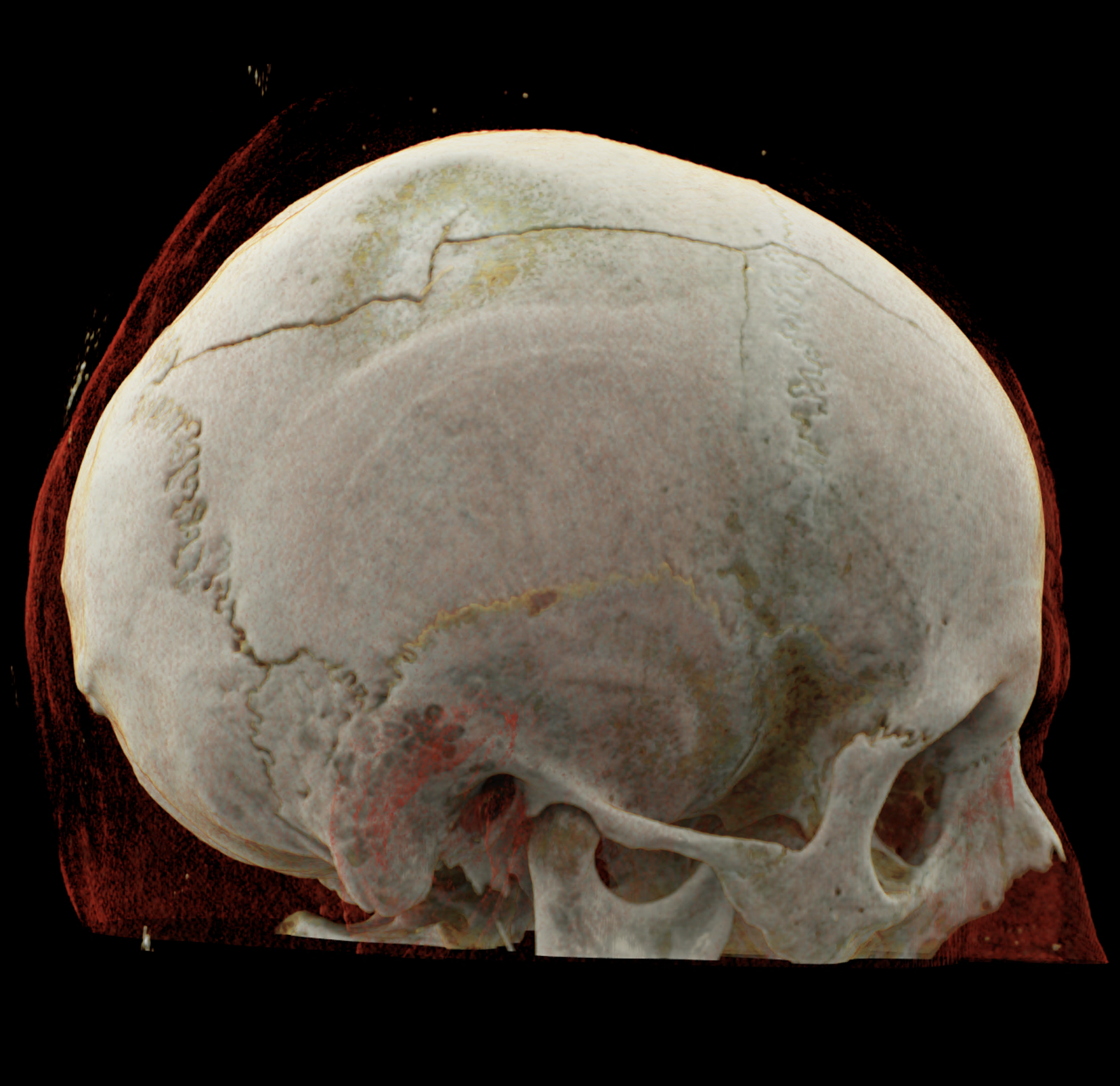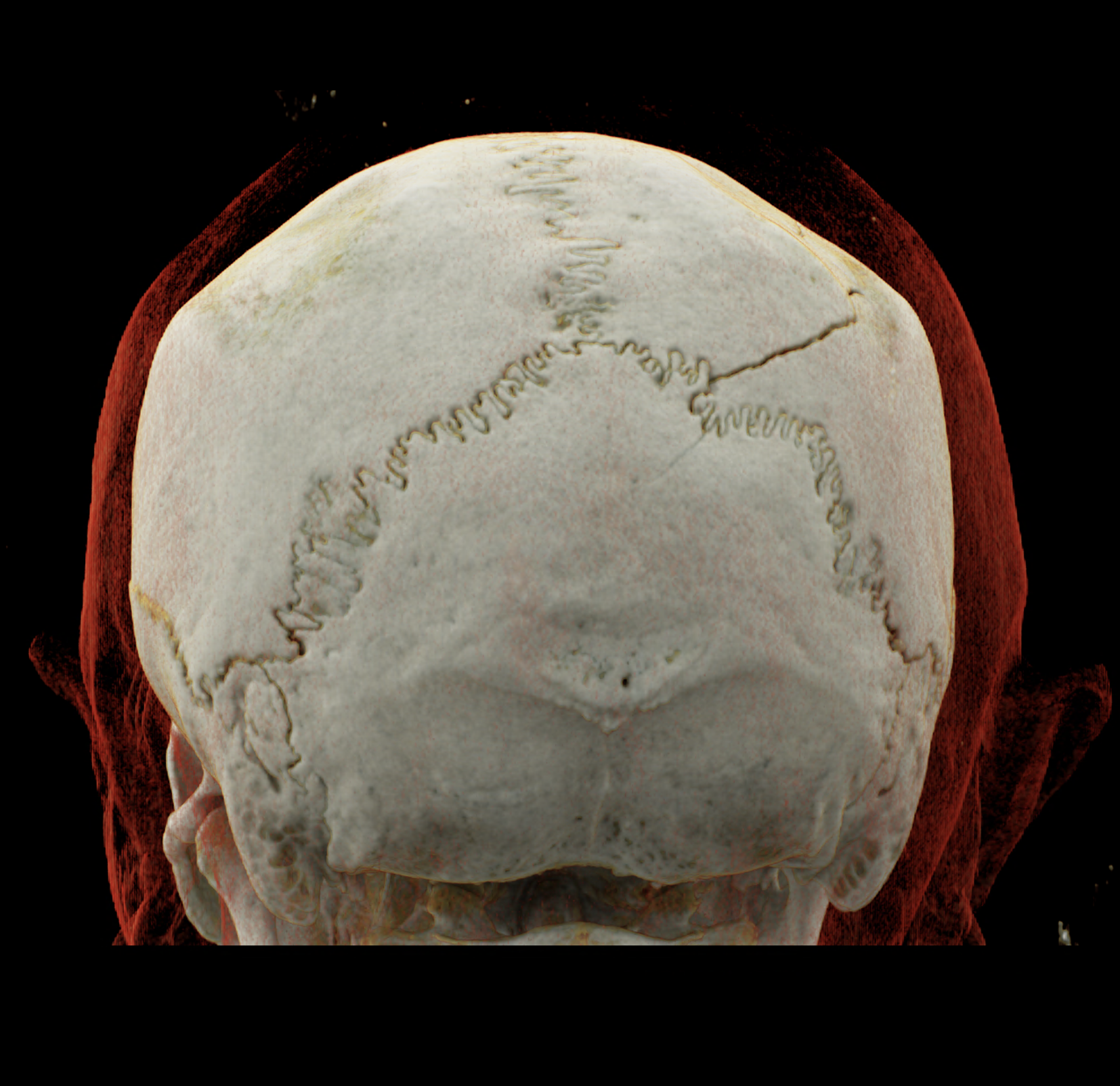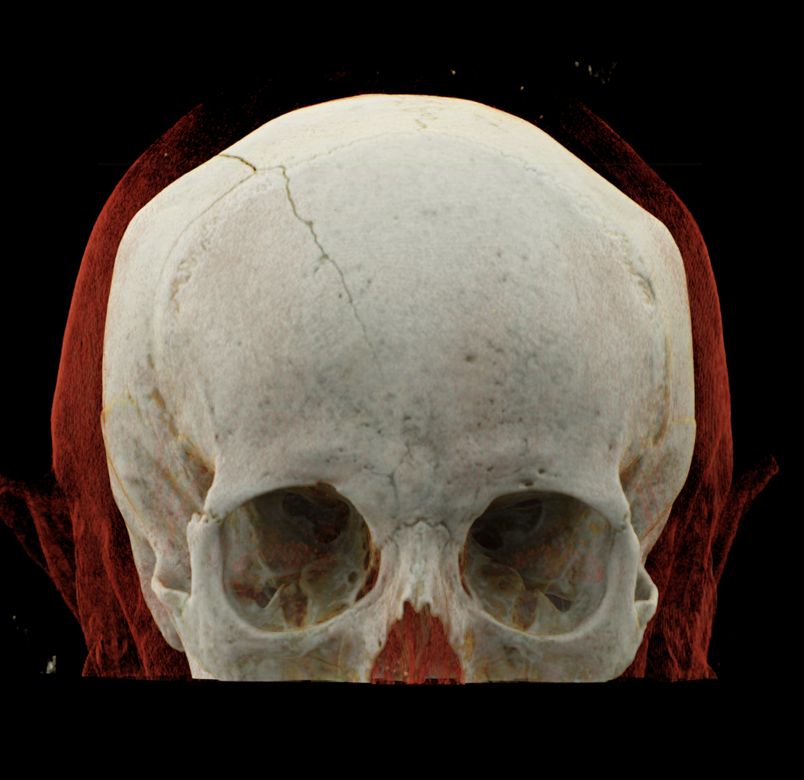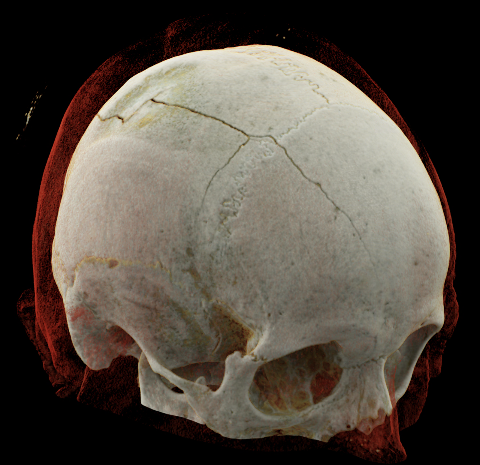 Three-dimensional reconstructions also show a complex skull fissure that extends from the frontal bone to the parietal and temporal bones.